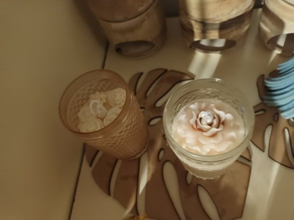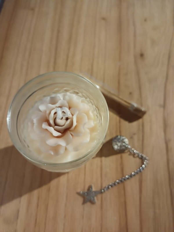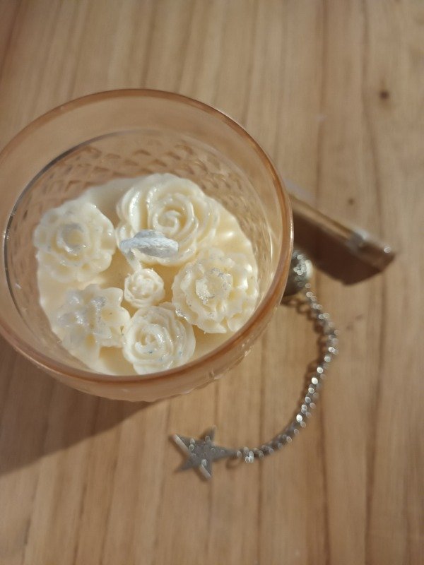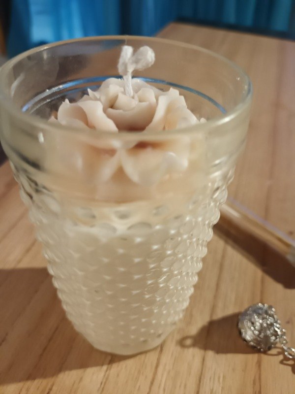Vela de diseño realizada en envase de vidrio labrado, técnica de bouquet de Flores.