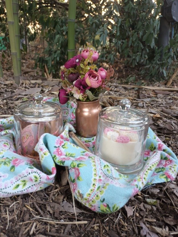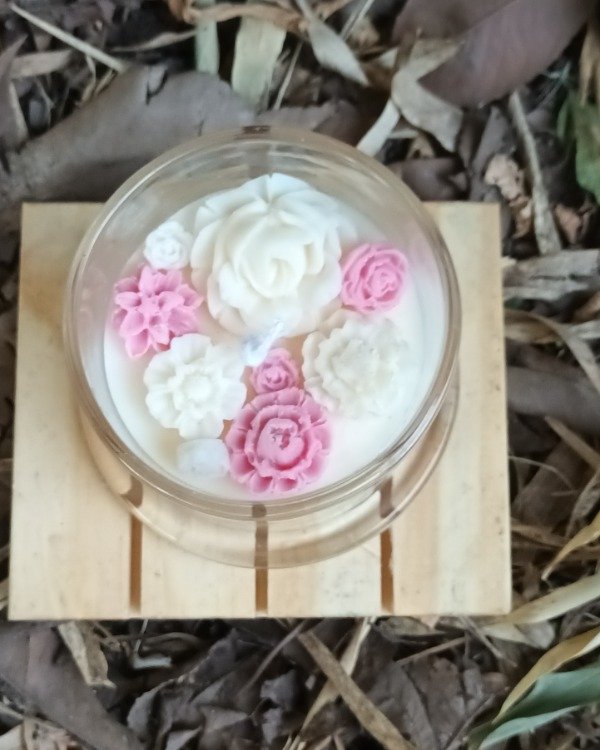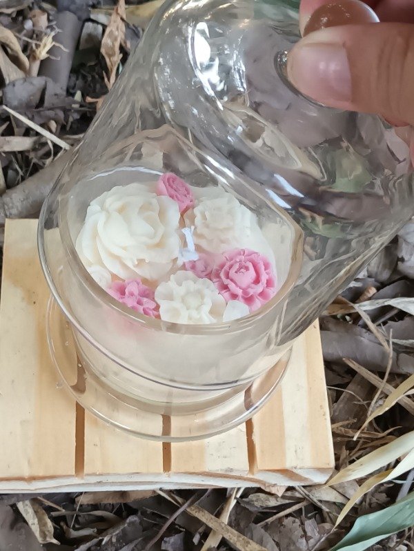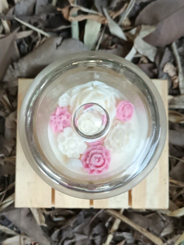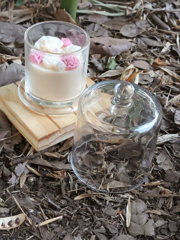 Vela realizada en envase de vidrio grueso con tapa, modelo cúpula transparente, técnica bouquet de Flores.